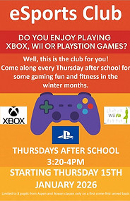 Our new after school club will be starting Thursday 15th January. This will be limited to 8 pupils from Aspen and Rowan classes only on a first come-first served basis.